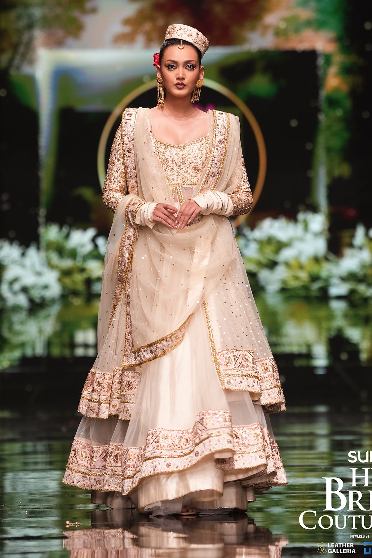 Commanding the spotlight on the BCW runway, this ivory double peshwas redefines ethereal grandeur. Crafted from delicate net, the silhouette is lavishly embellished with golden sequins, nakshe, zardozi, and crystal work, creating a luminous interplay of texture and shine. The look is completed with a raw silk lehnga and net dupatta featuring four-sided embellished borders and a soft sequin spray. A timeless vision of grace, crafted to captivate from every angle.