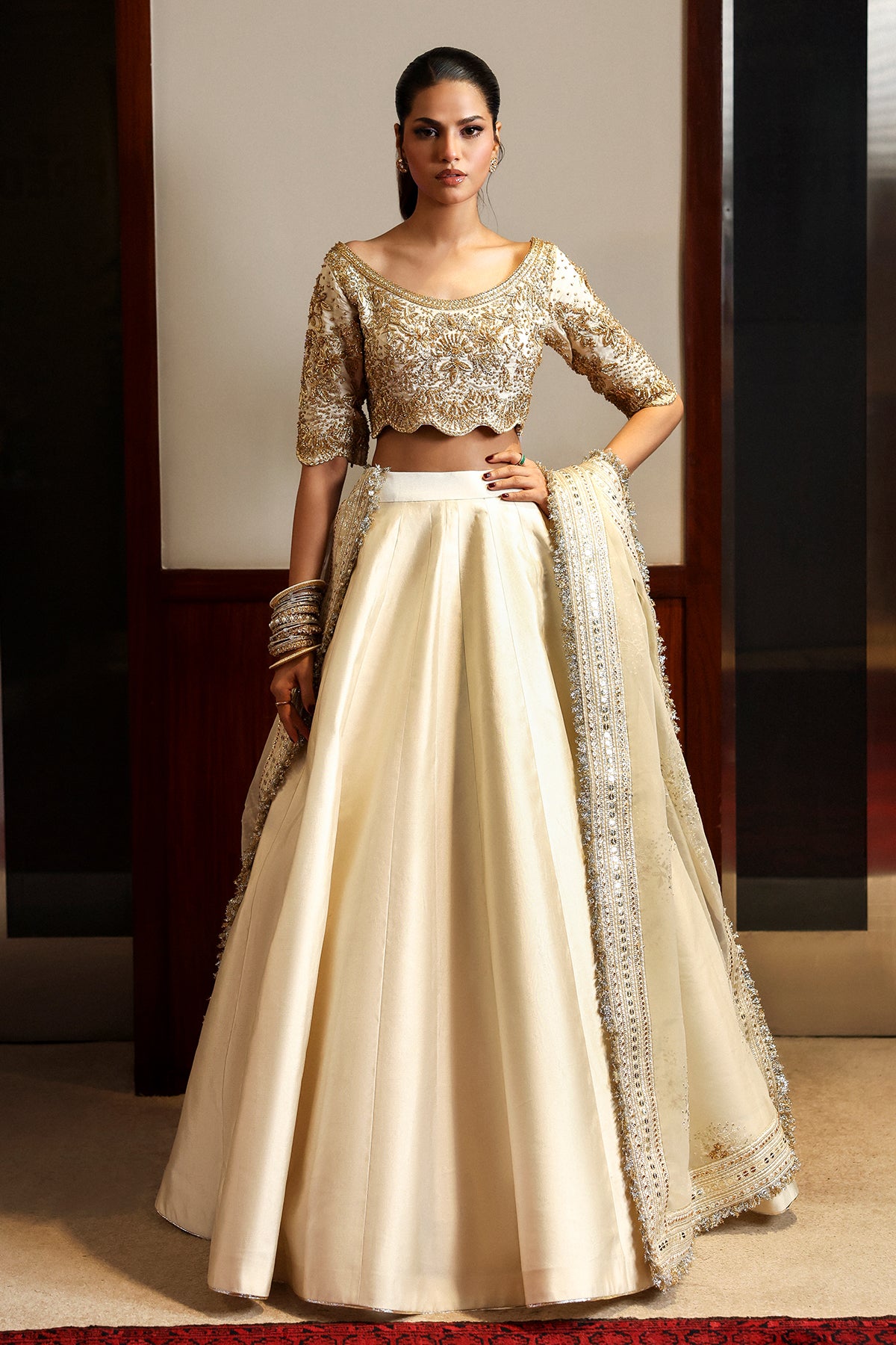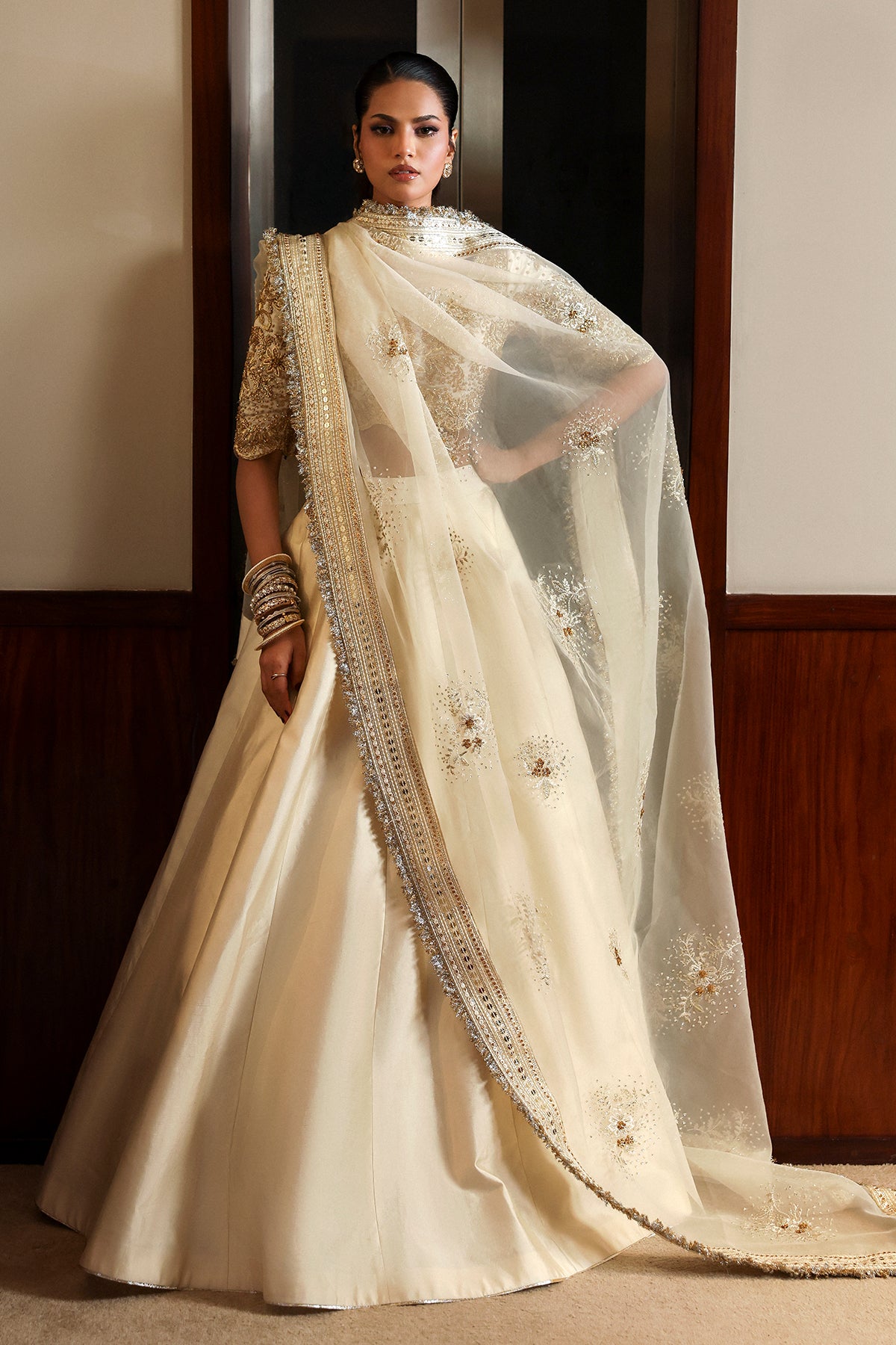 An ivory silk lehenga choli that whispers elegance through every detail. The choli is fully hand-embellished in golden tones, radiating sophistication. It is paired with an organza dupatta, beautifully framed with four-sided embroidered borders and a delicate spray of motifs, finished with classic kiran lace detailing. This ensemble is made for those who make simplicity look extraordinary.