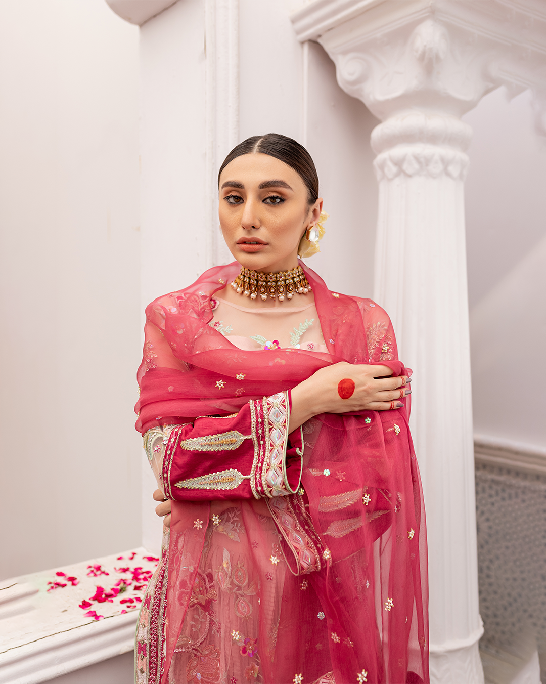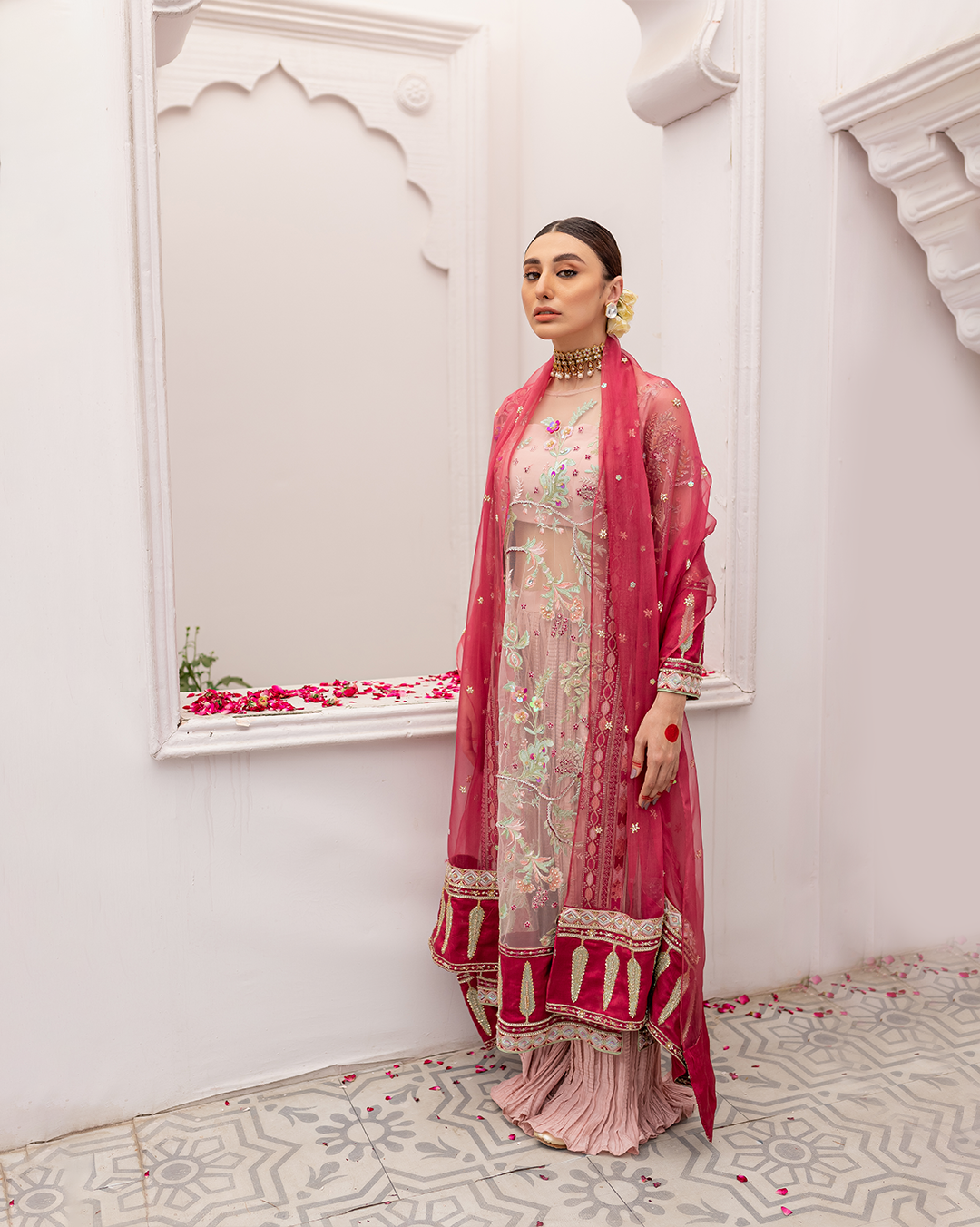 Description: Indulge in the alluring elegance of this light pink organza shirt, adorned intricately with luxurious hand embellishments. It comes with silk sharara pants and organza dupatta having heavy borders and sequin spray, exuding an aura of grace.
