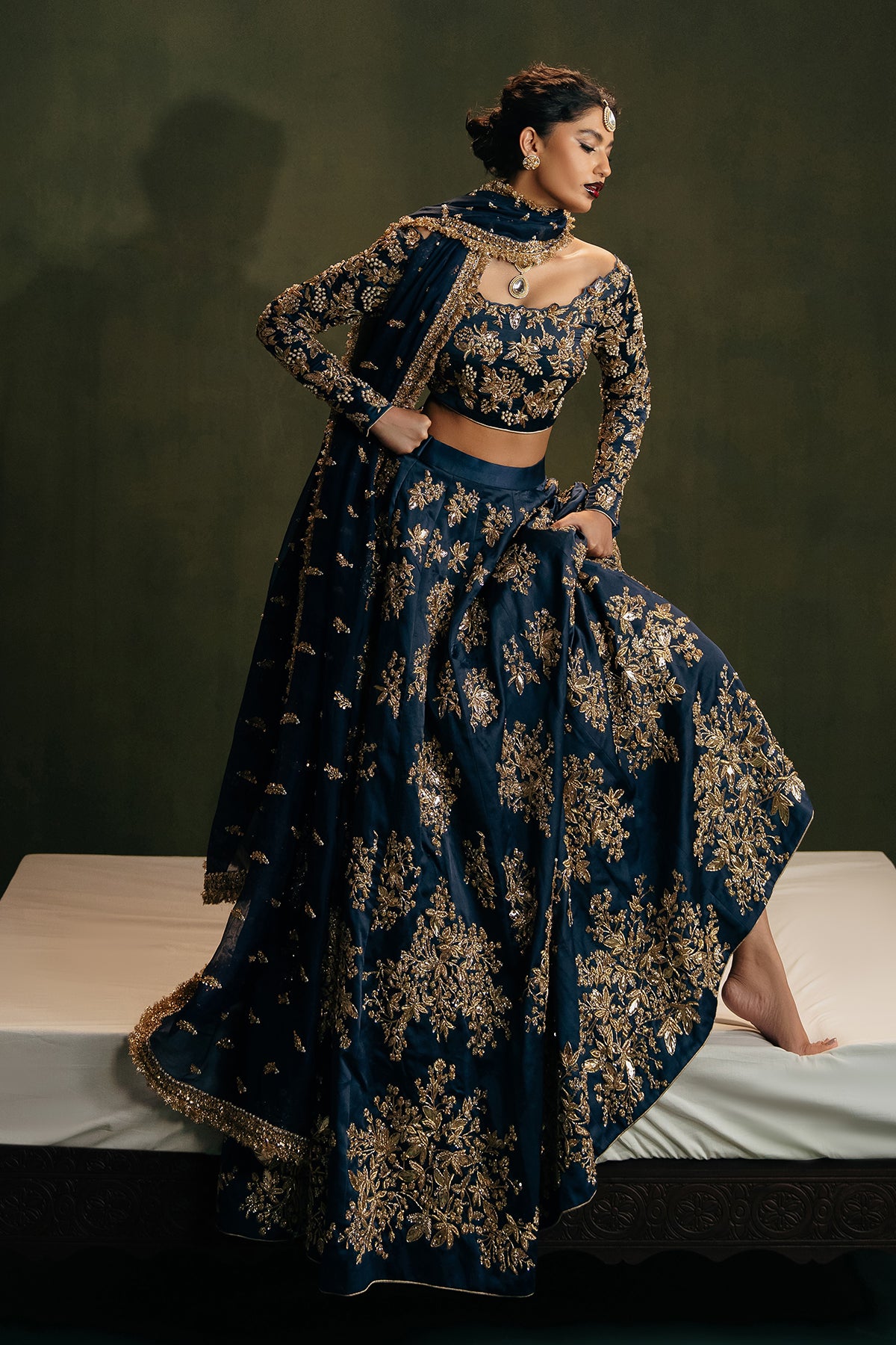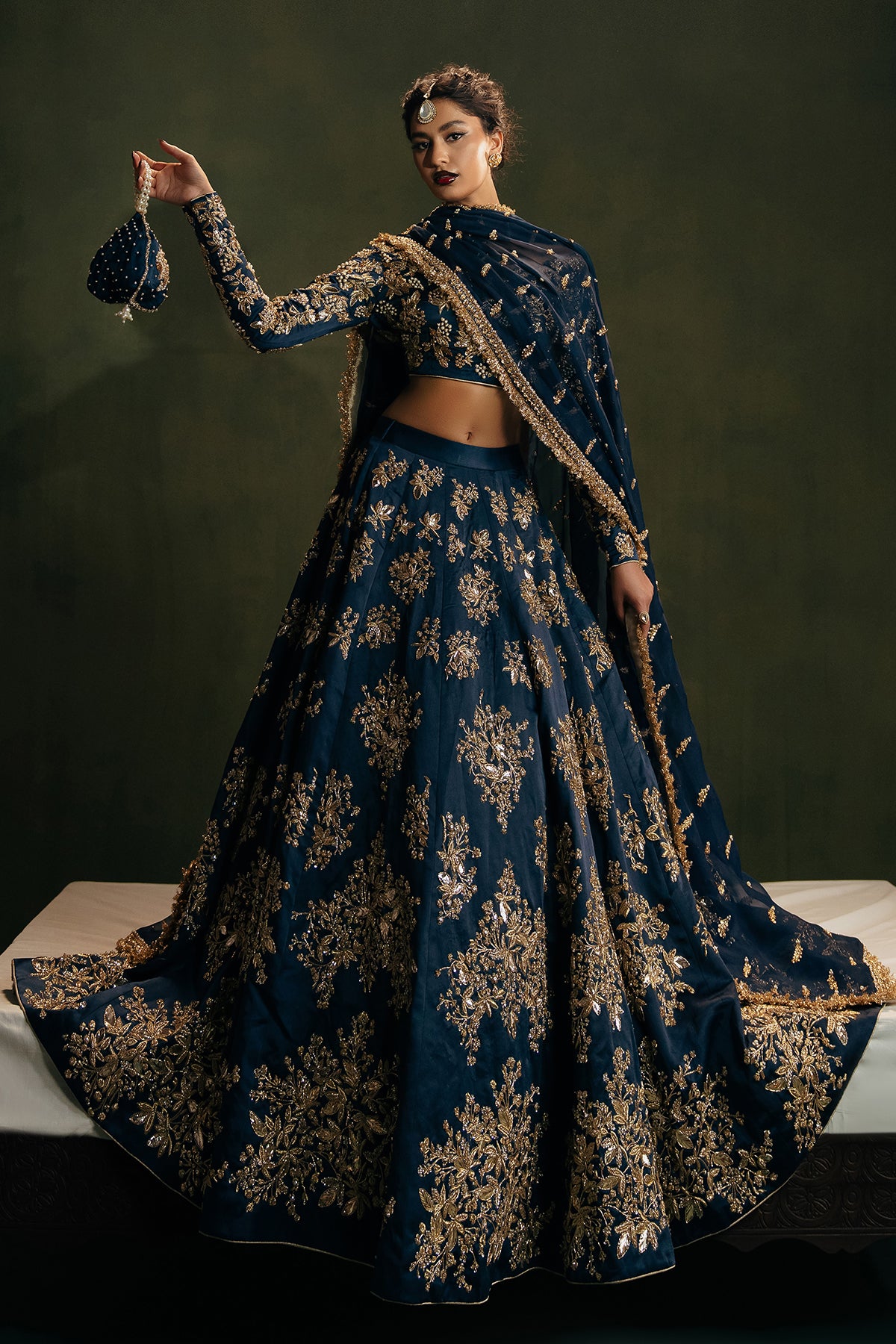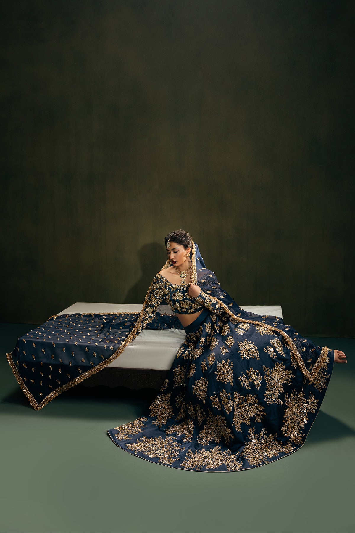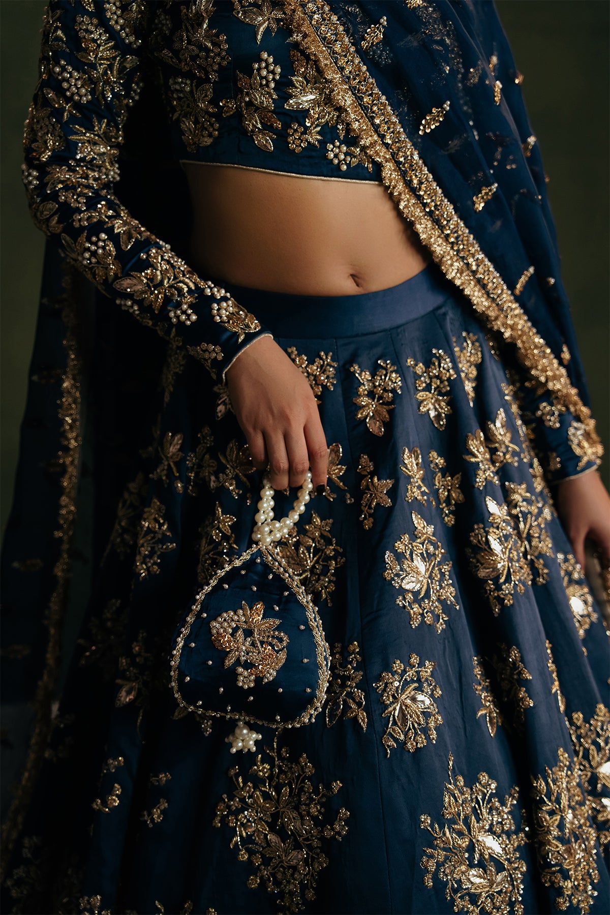This regal bridal ensemble is rendered in a beautiful shade of navy blue, composed of a richly adorned satin silk blouse and lehenga, both lavishly worked on the front and back with delicate hand embellishments. The craftsmanship features a luxurious mix of naqshi, dabka, pearls, and shimmering diamantes, coming together to create a masterpiece of opulence and finesse. Paired with an ethereal organza dupatta, framed with a heavily embellished four-sided border, adorned with a delicate spray and finished with a traditional kiran lace, the look exudes timeless grandeur. Completing the ensemble, a gracefully adorned pouch featuring handworked motifs adds the final touch of regal charm.