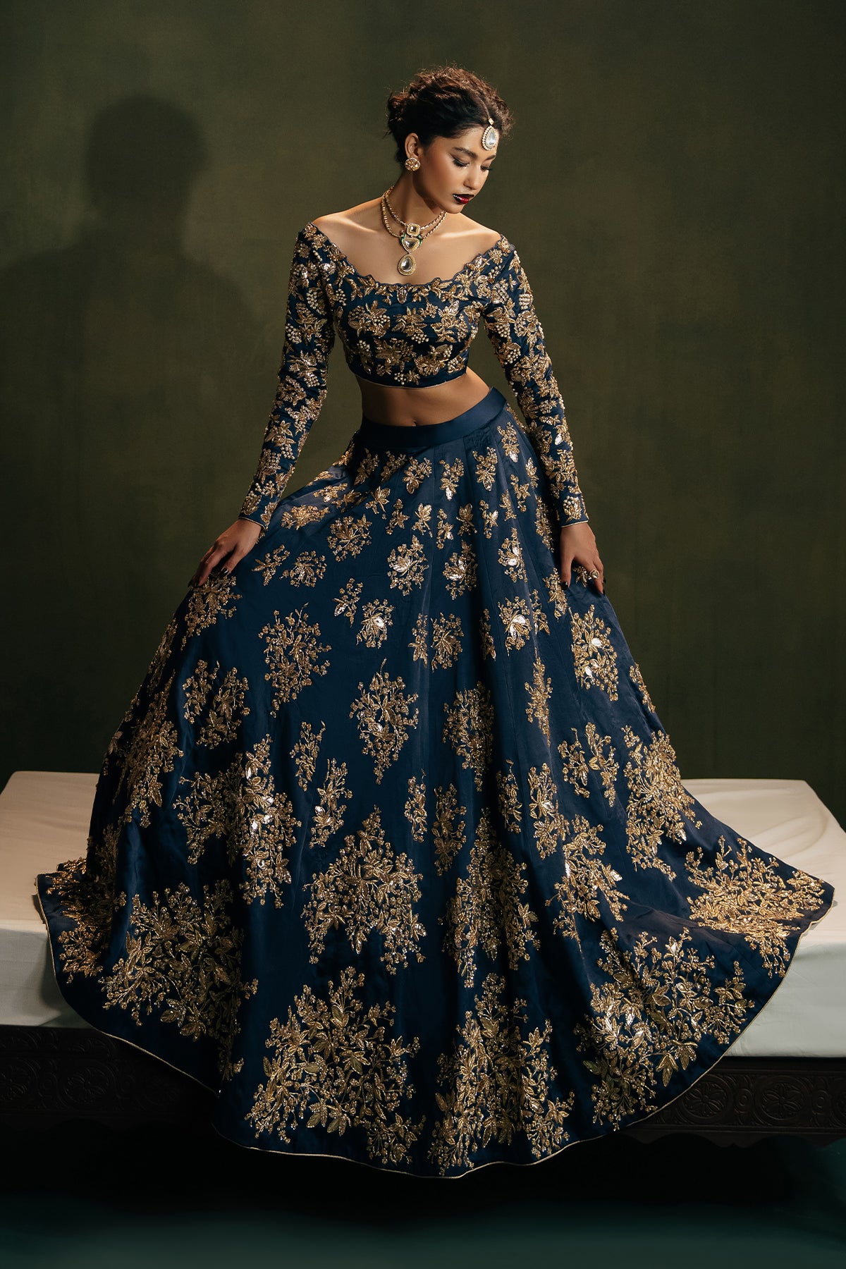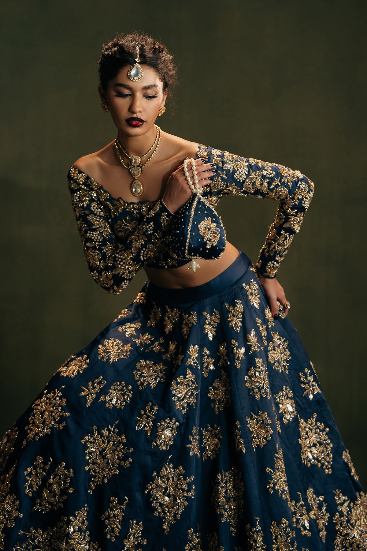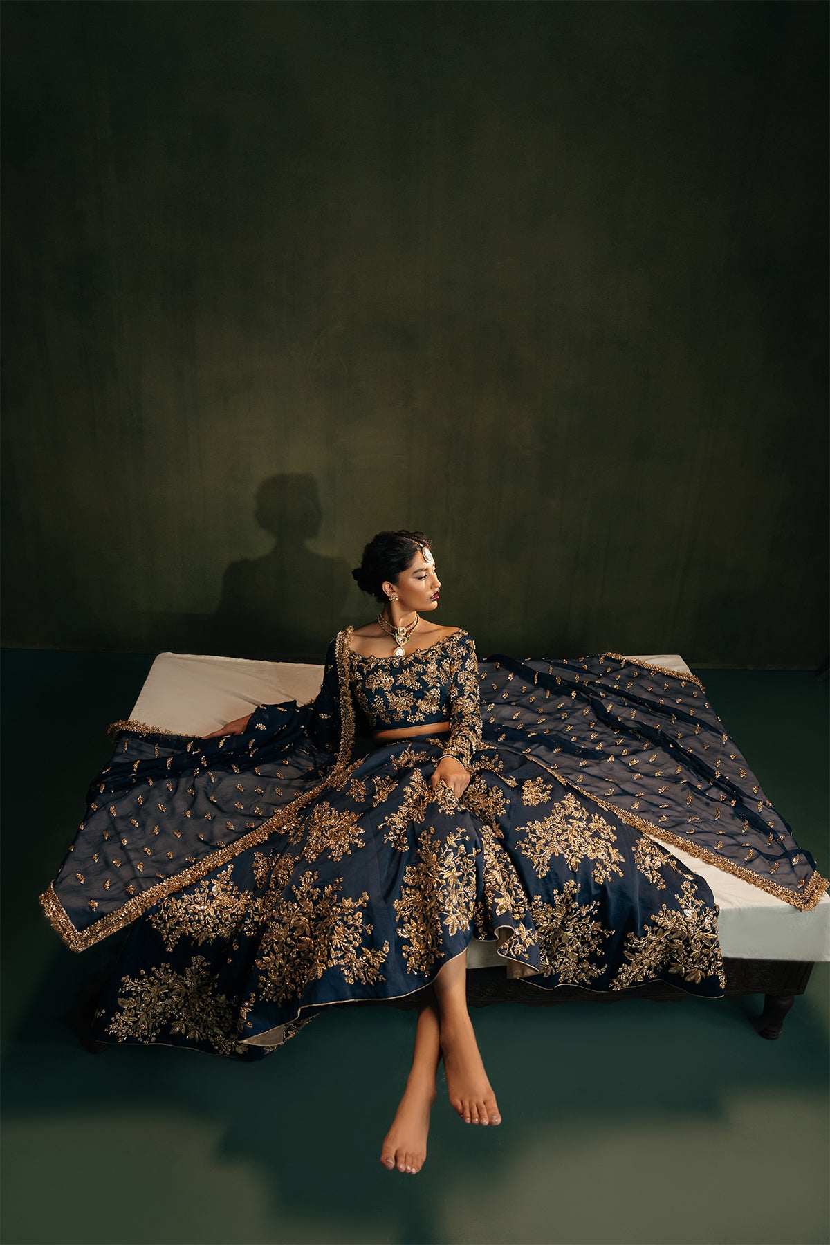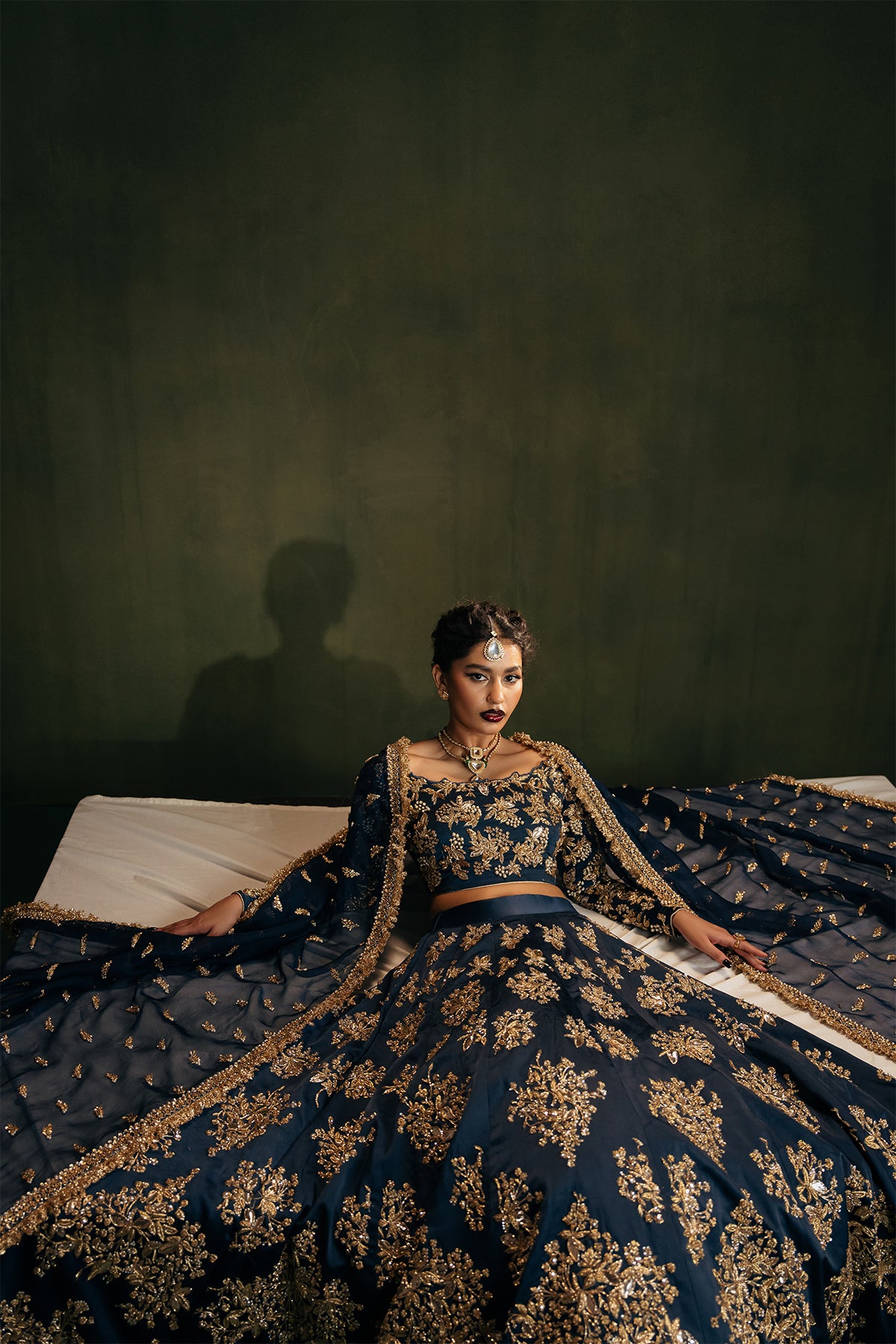This regal bridal ensemble is rendered in a beautiful shade of navy blue, composed of a richly adorned satin silk blouse and lehenga, both lavishly worked on the front and back with delicate hand embellishments. The craftsmanship features a luxurious mix of naqshi, dabka, pearls, and shimmering diamantes, coming together to create a masterpiece of opulence and finesse. Paired with an ethereal organza dupatta, framed with a heavily embellished four-sided border, adorned with a delicate spray and finished with a traditional kiran lace, the look exudes timeless grandeur. Completing the ensemble, a gracefully adorned pouch featuring handworked motifs adds the final touch of regal charm.