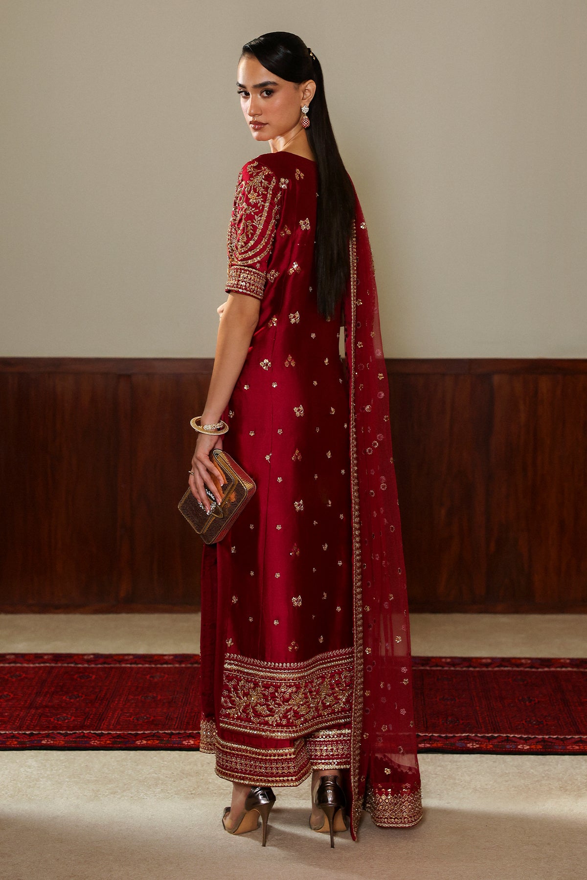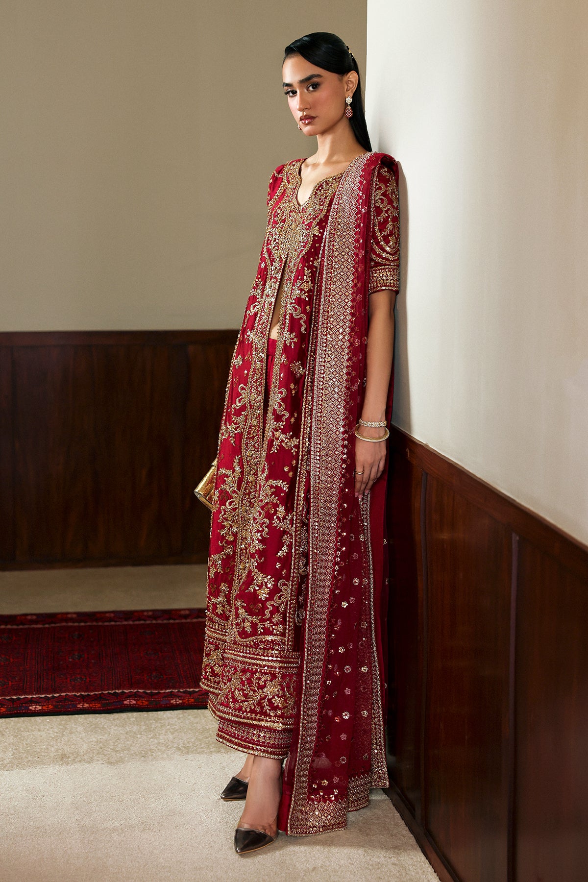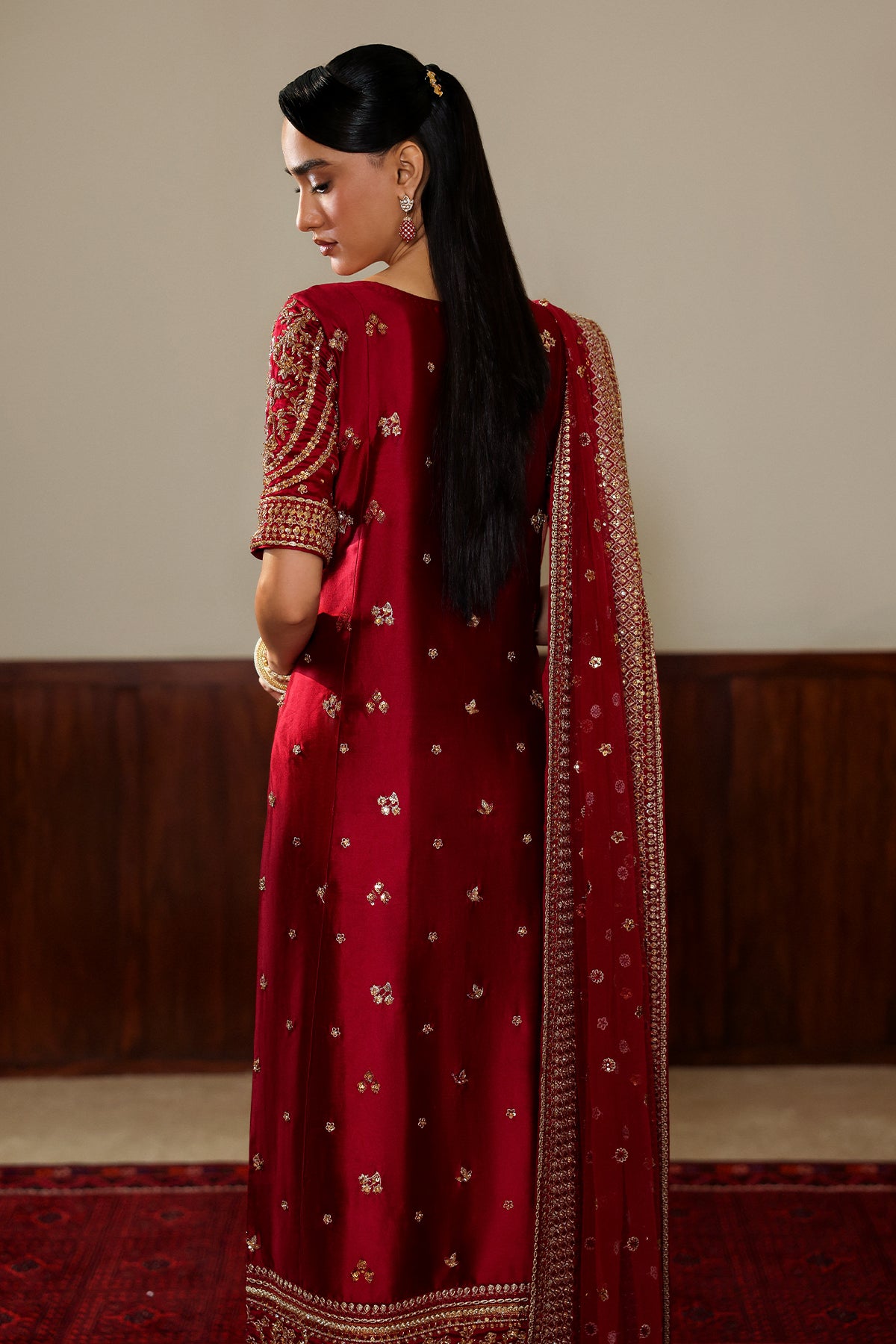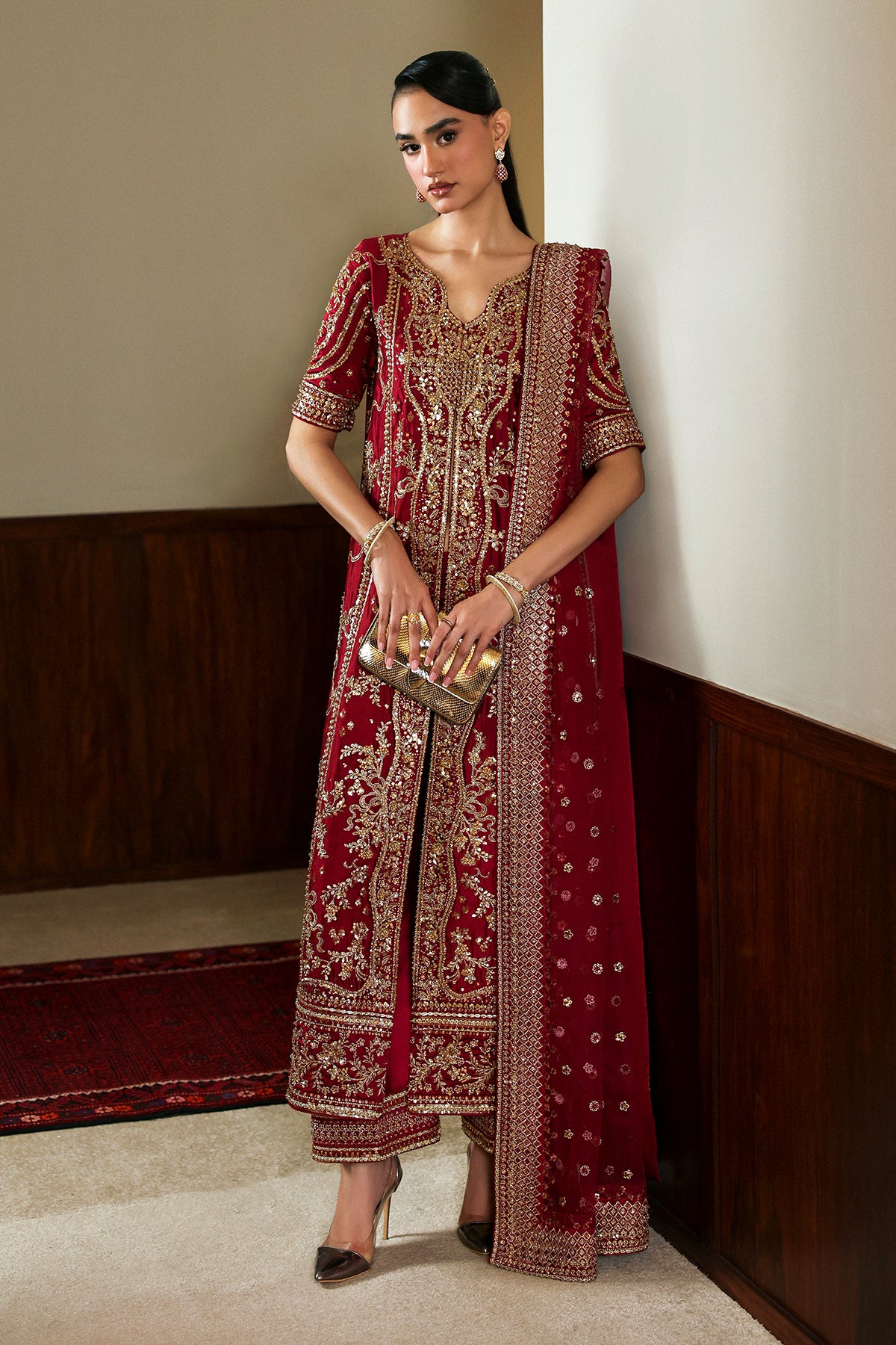 Featuring a front-open jacket in the rich hue of wine red, crafted from luxurious silk and adorned with intricate golden embellishments across the front, back, and sleeves. Paired with matching silk culottes delicately finished with embroidered borders. And a net dupatta, framed with four-sided embellished borders and an all-over spray, adds a sheer veil of glamour. This look defines modern-day royalty.