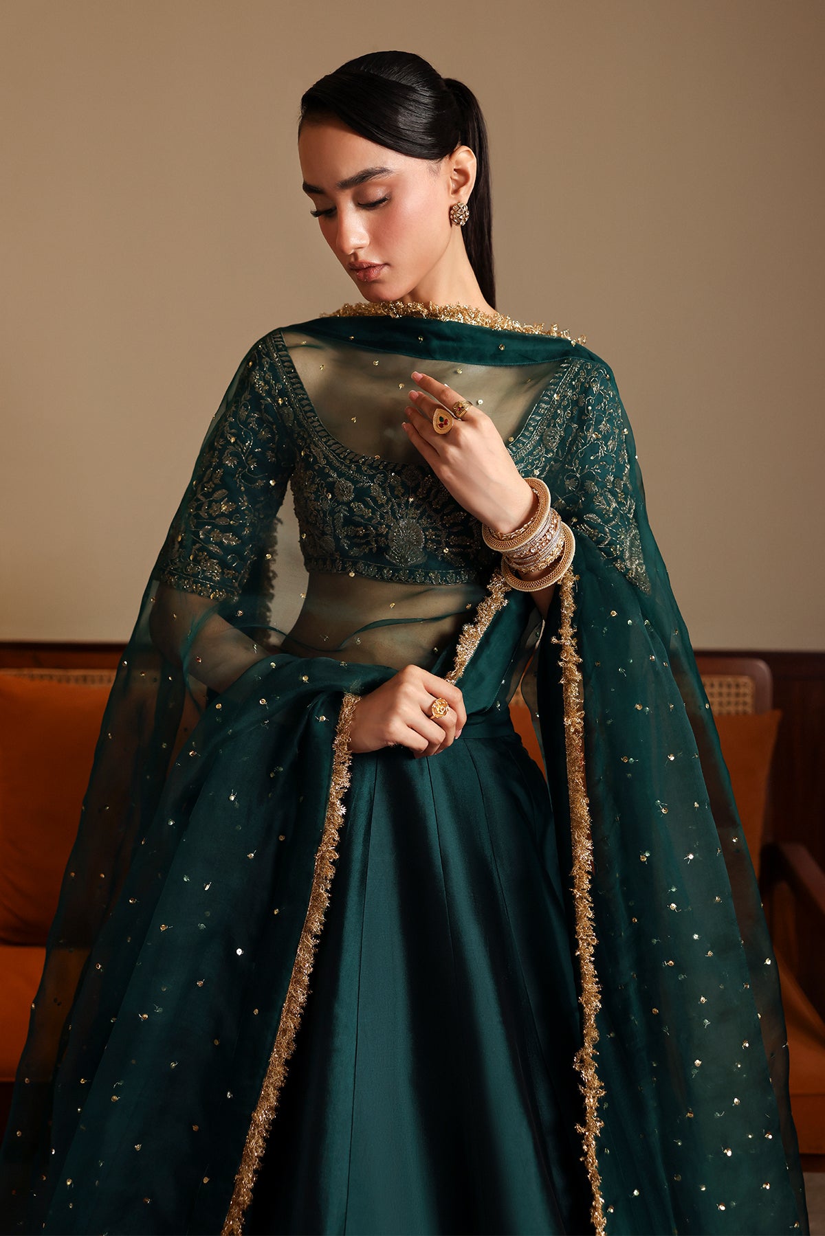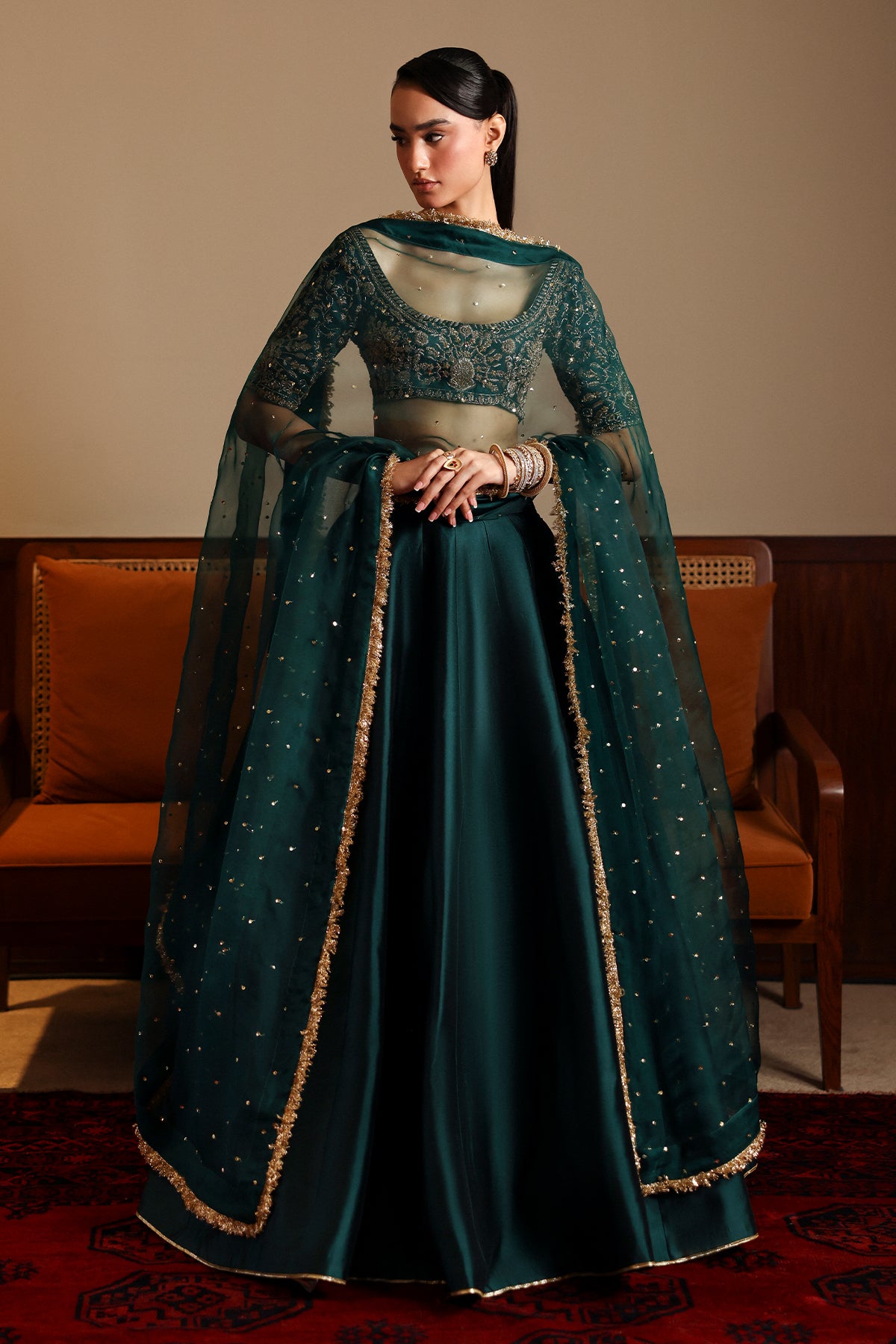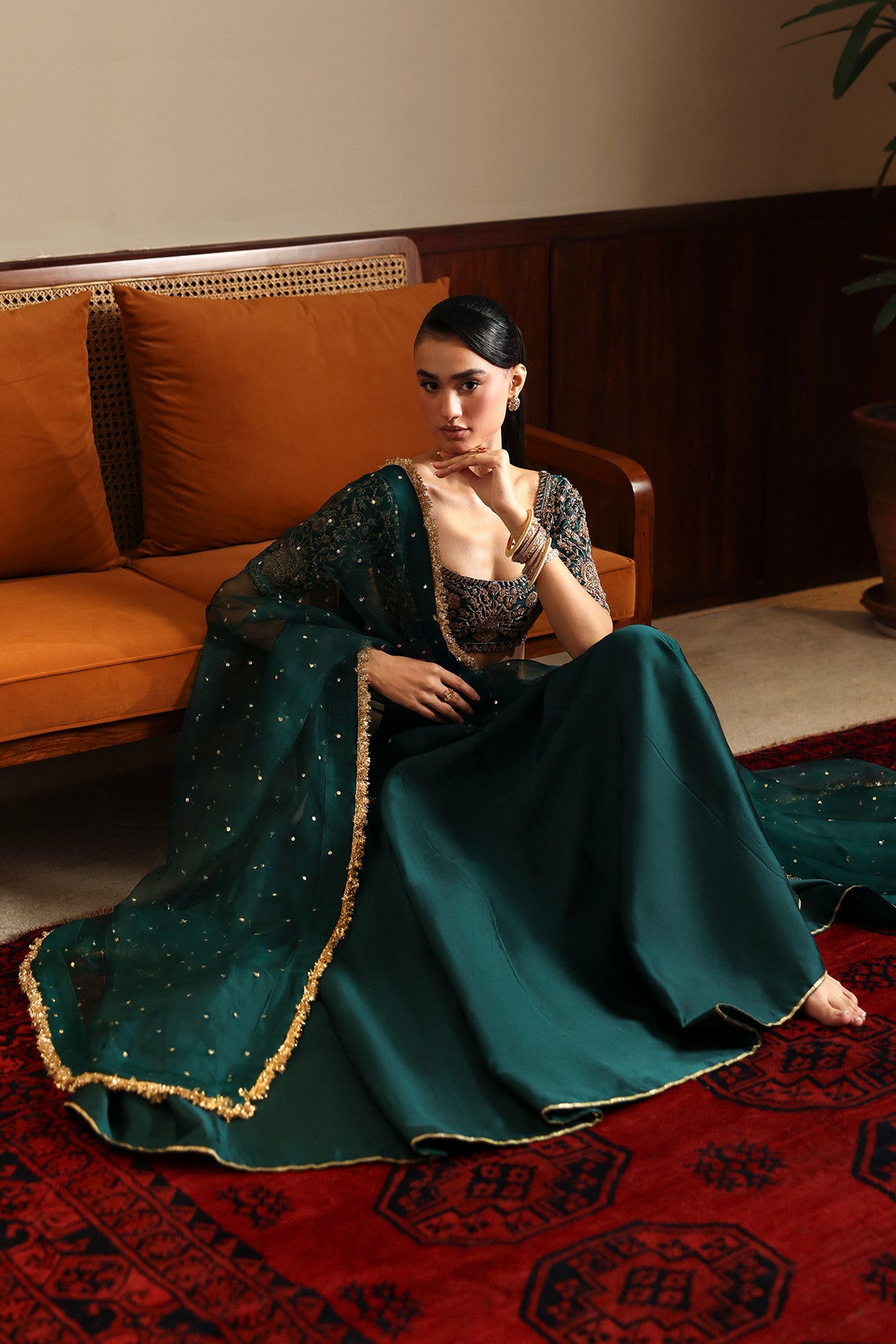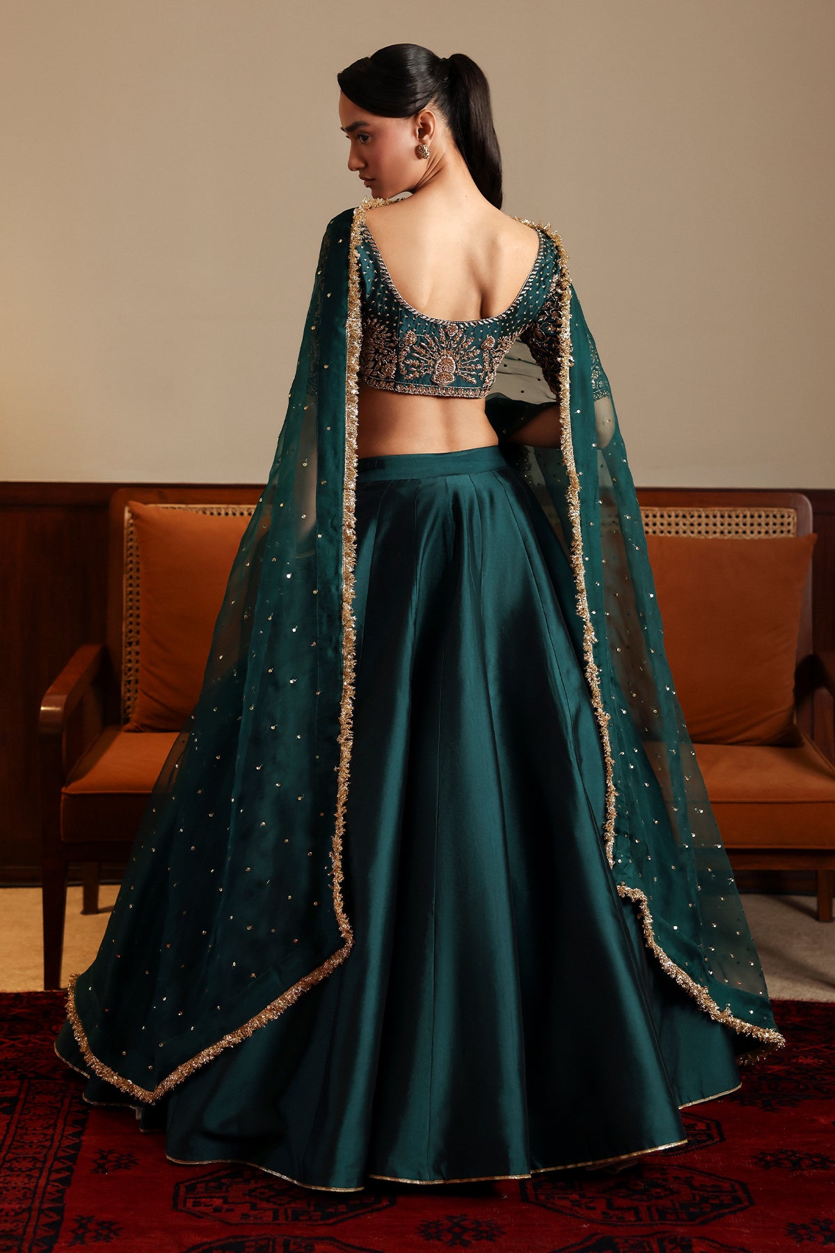 This breathtaking ensemble is rendered in a majestic shade of emerald green. The silk choli is artfully adorned on the front, back, and sleeves with intricate golden adda work showcasing refined detailing. Paired with a plain silk lehenga and organza dupatta, accentuated with a soft sequin spray and finished with classic kiran lace.