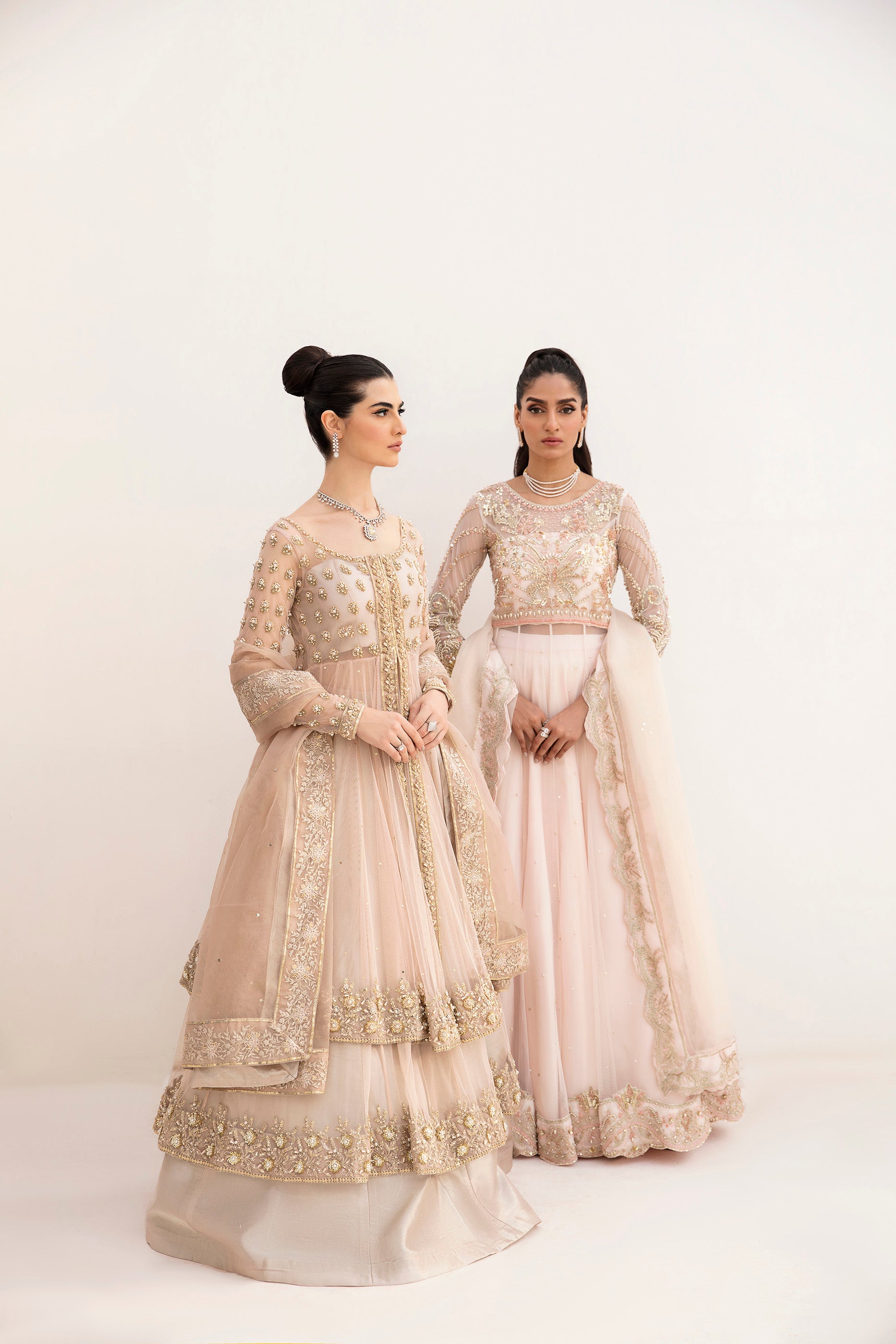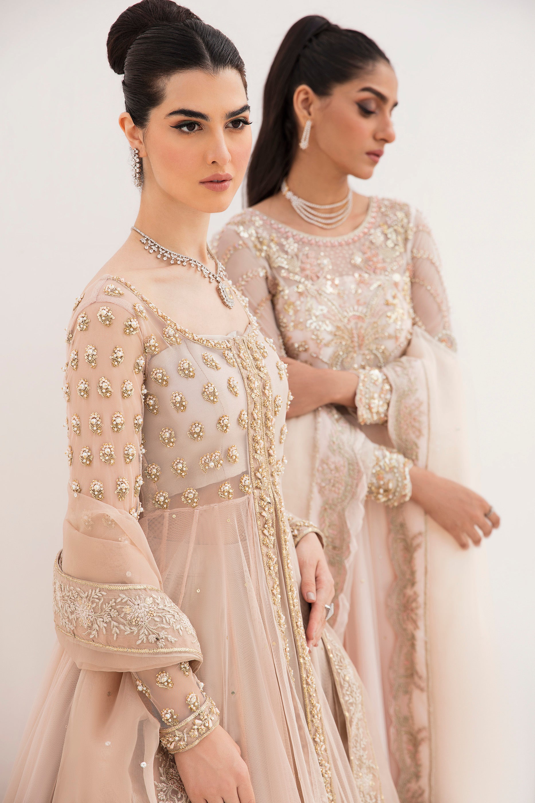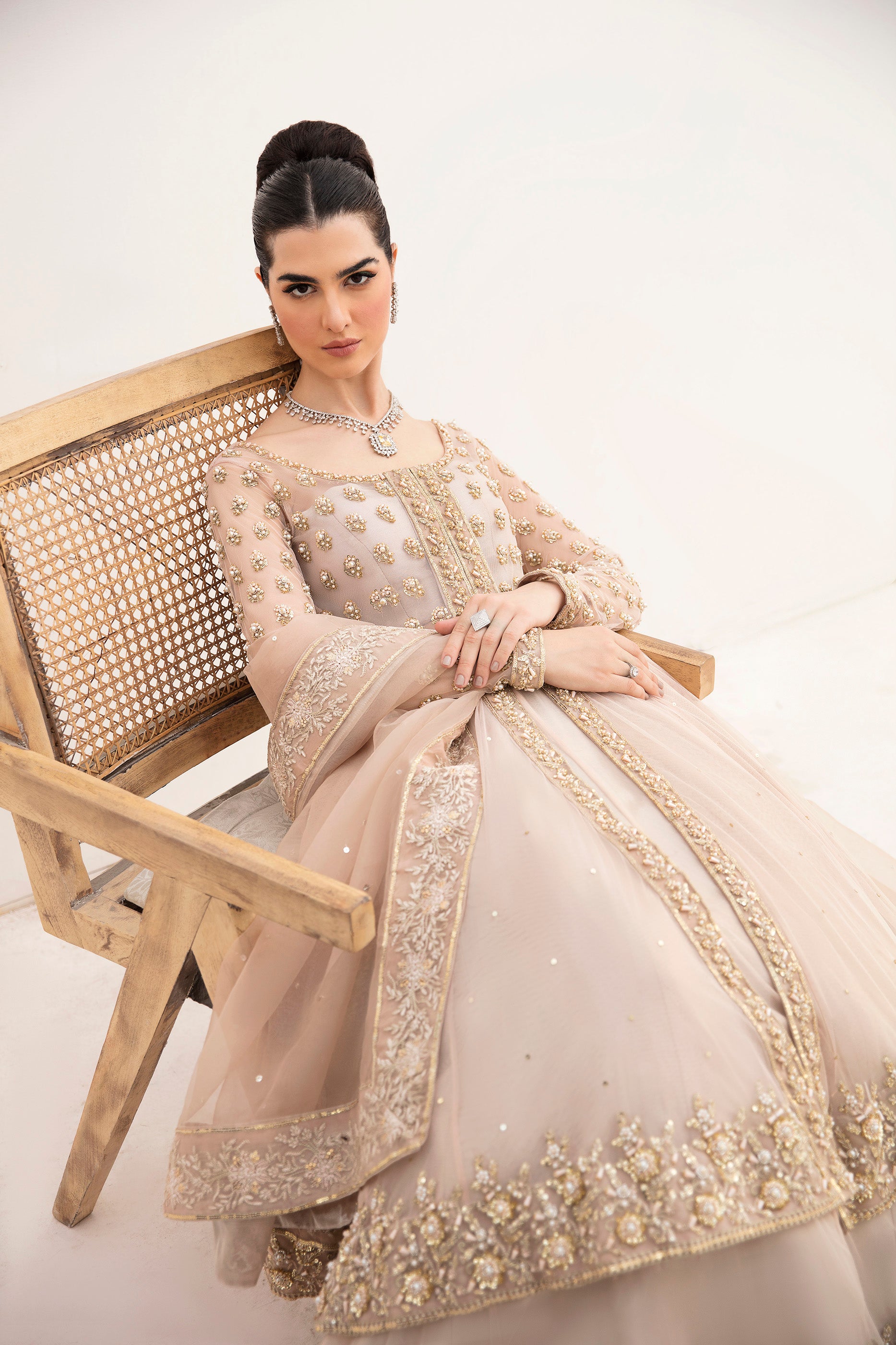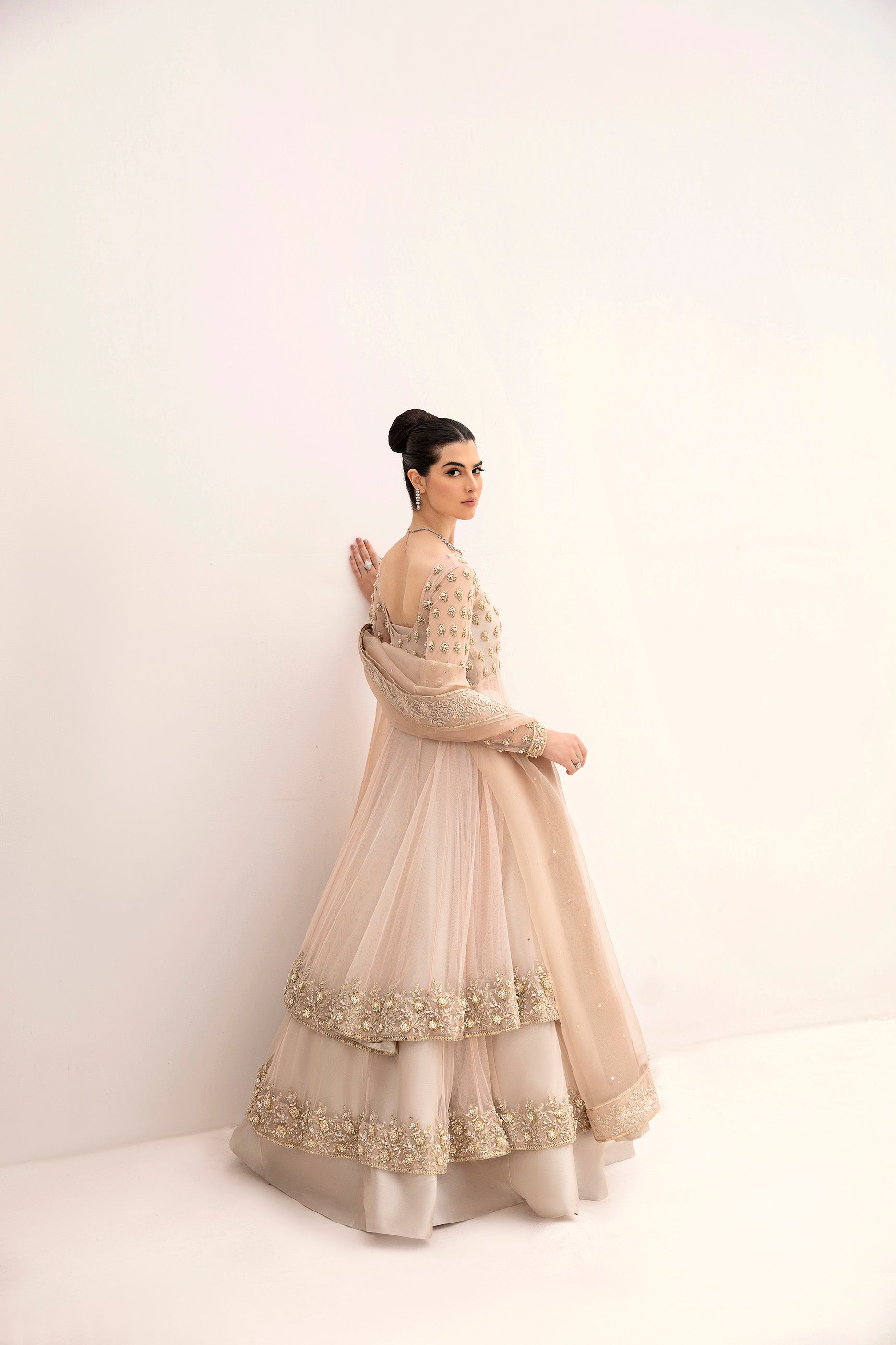 A resplendent double-layered beige rose net pishwas evokes a sense of regal allure that commands attention. It is crafted with exceptionally intricate gold embellishments of adda work on the bodice, sleeves, and hemline. The multi-head borders along the neckline and center add a touch of sophistication.