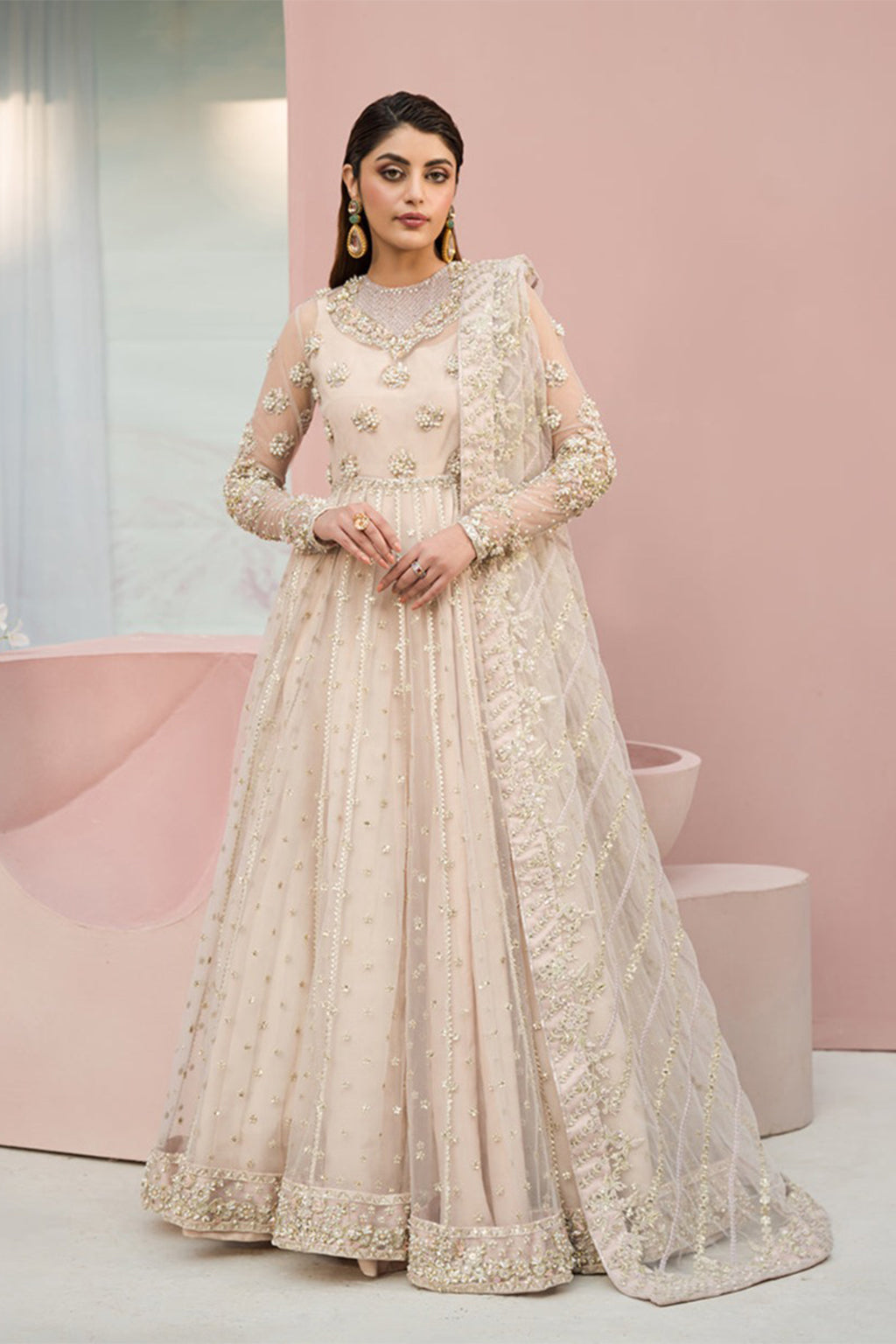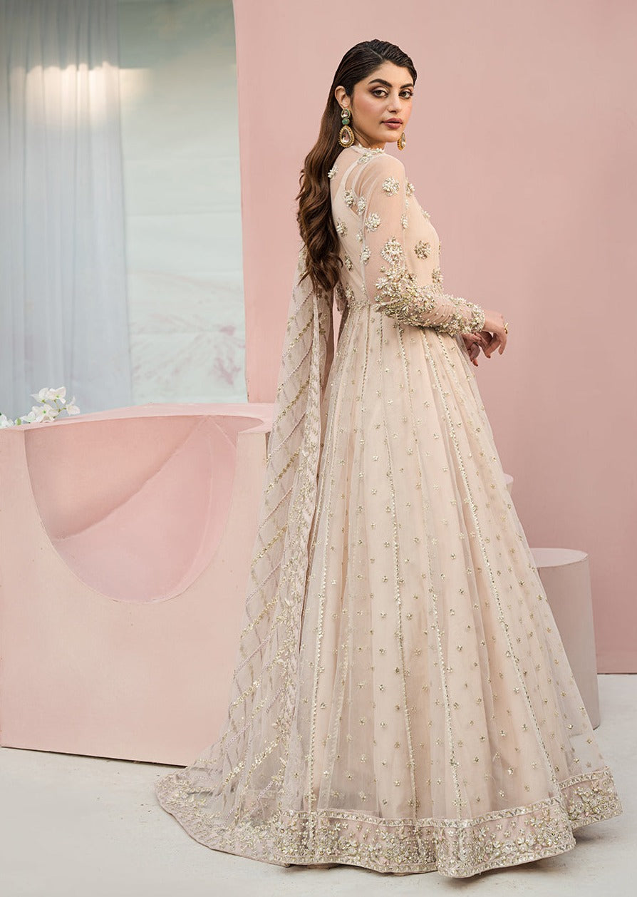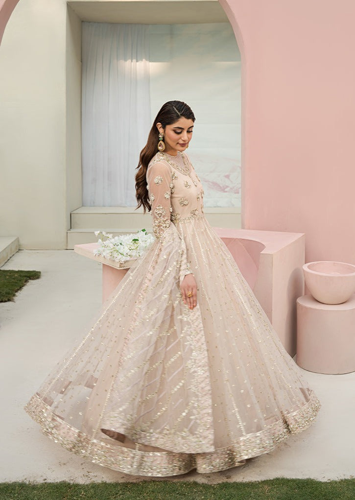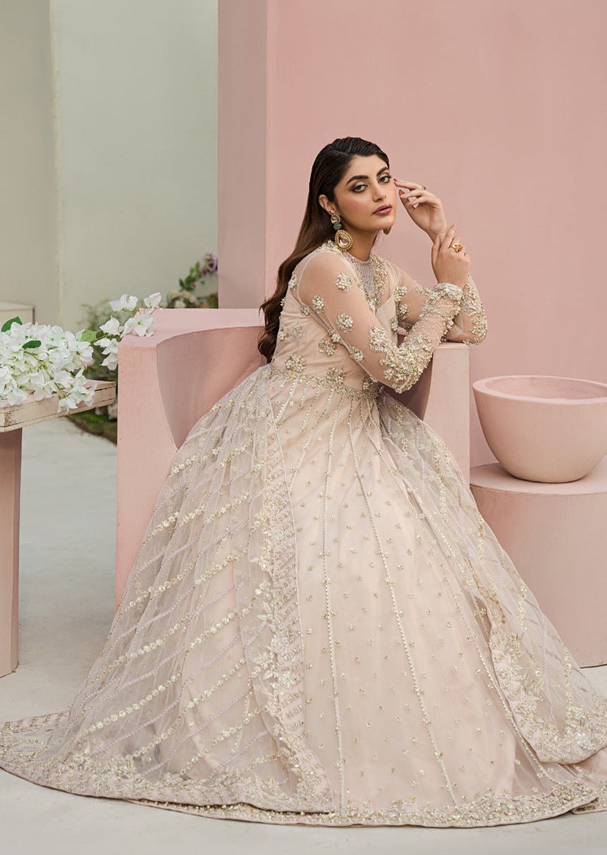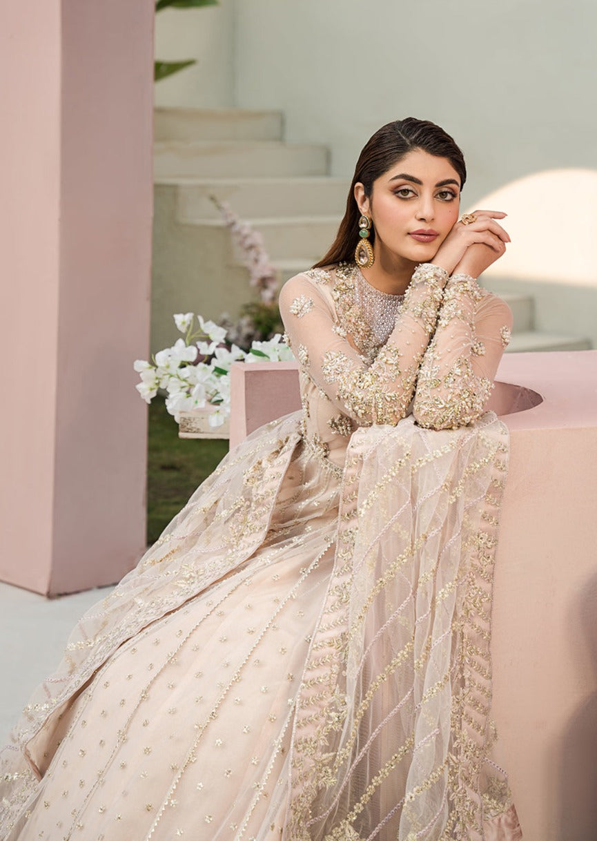Description: Featuring graciously crafted net pishwas in resplendent hues of salmon pink. Bedecked with opulent golden hand embellishments and intricate details of gotta lacing on panels, creating a celestial masterpiece. Paired harmoniously with a heavily embroidered net dupatta, ensuring an interplay of style and sophistication.