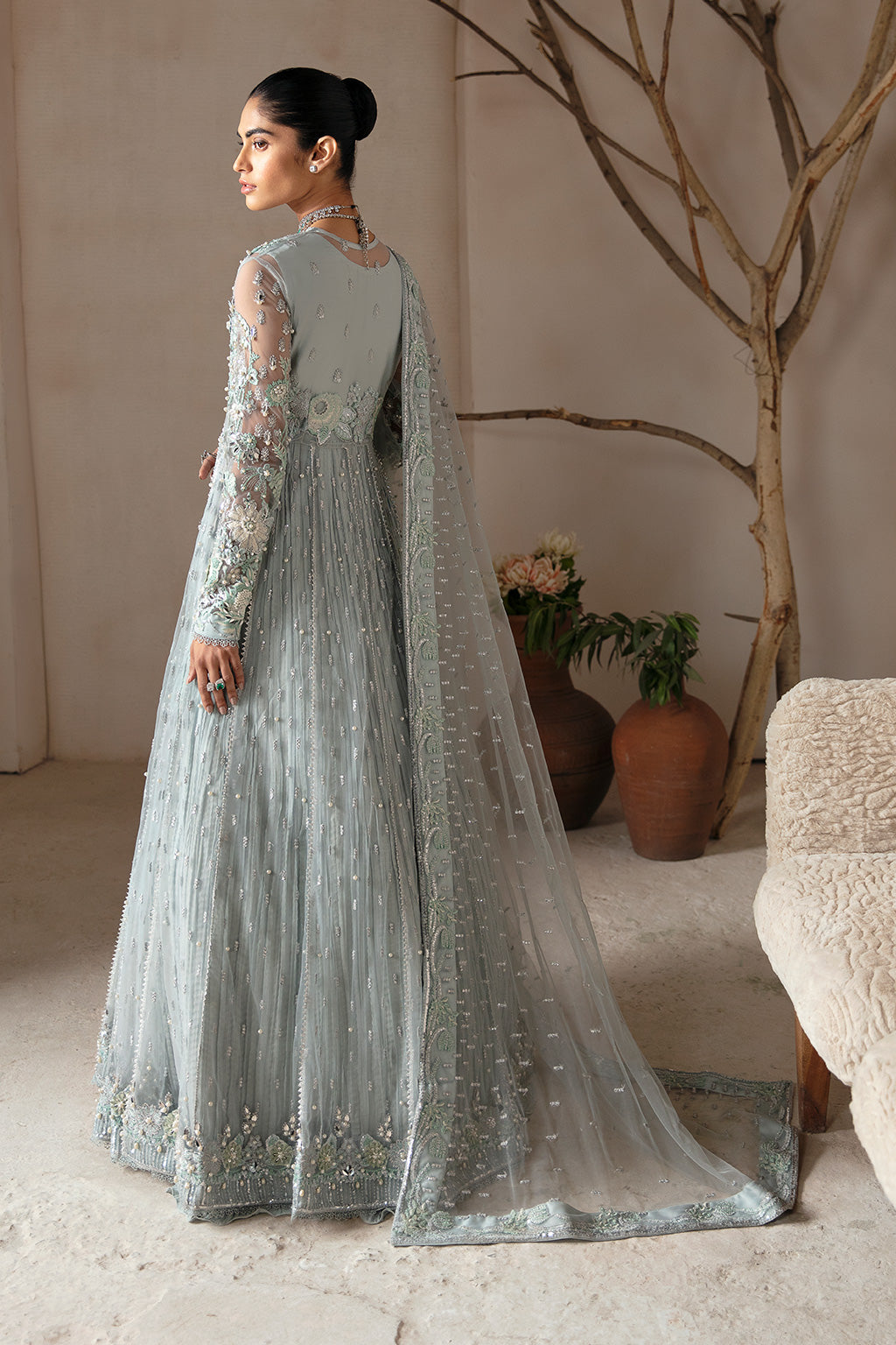 It is complemented with a net dupatta boasting intricate embroidered borders and sequin spray, weaving a narrative of refined artistry and opulent craftsmanship.